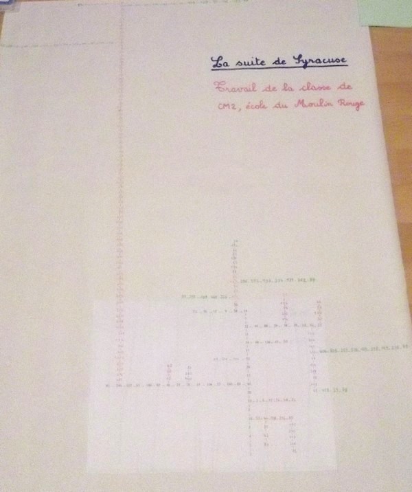 Séance 3 : L'enseignant a au préalable repris les travaux de chaque groupe et reporté sur le graphe, le cas échéant, les suites qui ne l'auraient pas été lors de la séance 2. Il a également fait une liste des nombres restant à traiter. Répartition par groupes de ces nombres résistants (qui nécessiteront une certaine persévérance !). On fera toujours travailler deux binômes sur un même nombre afin de faciliter la confrontation et la validation des résultats.