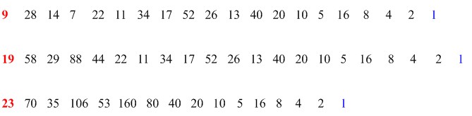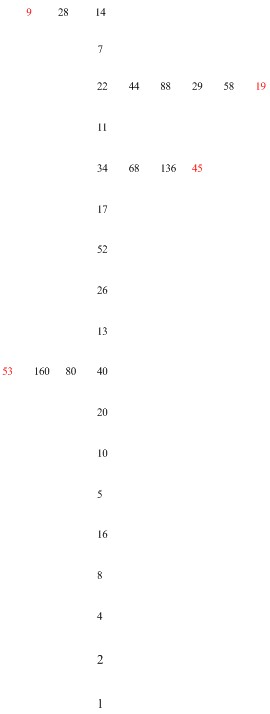 Séance 1 : Présenter l'énigme (comme un jeu sur les nombres) : "Choisir un nombre de deux chiffres. S'il est pair, en prendre la moitié ; s'il est impair, le multiplier par 3 puis ajouter 1. Recommencer à appliquer la même règle avec le nombre obtenu et ainsi de suite... S'arrêter lorsqu'on obtient 1."