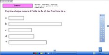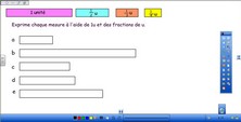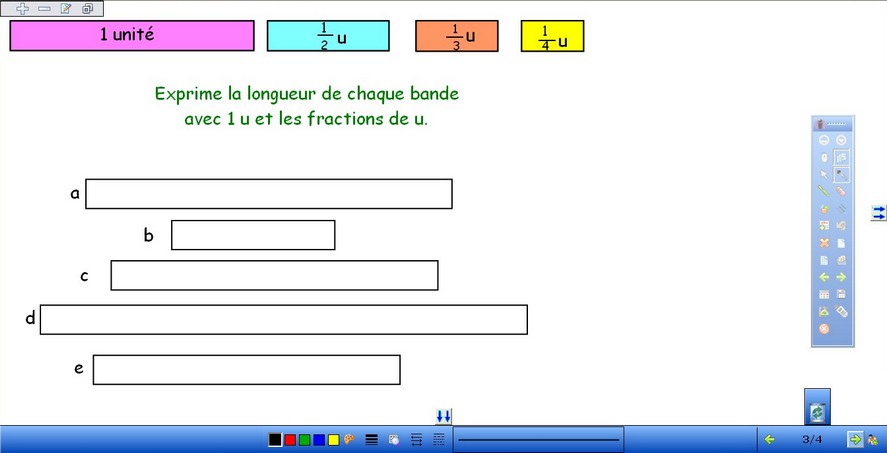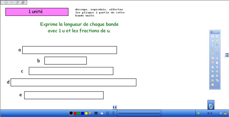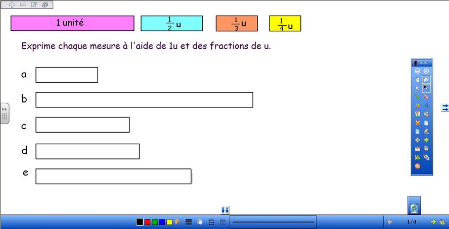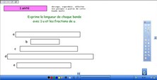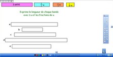 Phase 1 : découverte de l'espace de travail : chaque élève vient à tour de rôle et à l'aide du stylet et de l'outil sélection fait glisser les étiquettes (unité ou fractions) pour mesurer la bande de son choix. Lecture de fractions et d'addition de fractions : Il énonce ensuite et écrit sur une affiche le résultat de sa mesure (exemple : E mesure 1 unité + 1/4u).