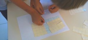 Les élèves sont par groupes de deux. Chaque groupe a devant lui un quadrillage représentant une pièce à recouvrir avec des carreaux.