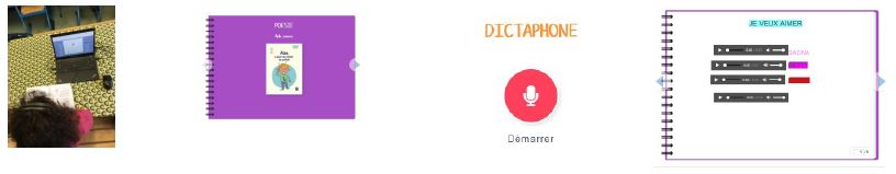 Chaque élève s’enregistre pour mettre en voix (ou lire) la poésie choisie. Chaque page du cahier multimédia collectif « poésie CE1 » regroupe les enregistrements audio des élèves.