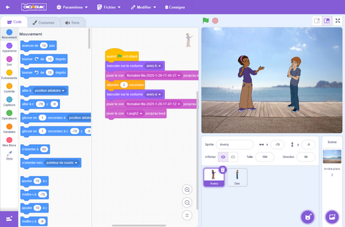 Codabloc est un outil de programmation par blocs qui permet aux élèves de créer entre autres des histoires interactives ou des jeux. Il offre une interface intuitive et des fonctionnalités variées.