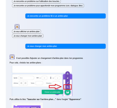 - Absence de nuances pédagogiques : Le chatbot suit un script prédéfini et peut manquer de la flexibilité et de l’empathie qu’un enseignant peut offrir en réponse aux besoins émotionnels ou éducatifs des élèves. Il fait référence à des procédures : l’élève peut très bien suivre la méthode pour importer un sprite sans pour autant en comprendre le sens (le rechercher dans les dossiers de l’ordinateur pour l’importer dans l’activité : savoir traiter et ordonner des données).
