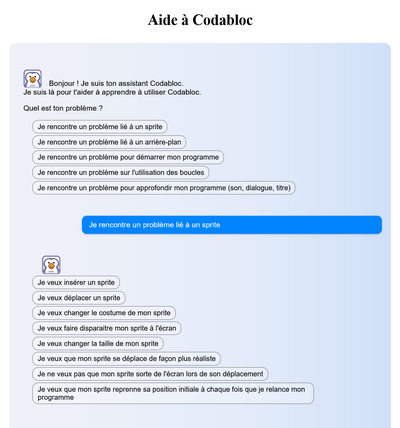Un chatbot a été conçu comme outil d’aide afin de rendre les élèves plus autonomes dans l’utilisation des fonctionnalités de Codabloc.