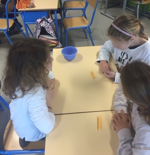 L’enseignant propose de jouer avec 22 cubes et d’appliquer l’algorithme. Il demande à deux élèves de jouer. La classe constate que l’algorithme ne permet pas de gagner à tous les coups. L’enseignant demande aux élèves d’expliquer pourquoi il ne fonctionne pas et combien de cubes il faudrait pour être sûr de gagner (on ne peut pas faire que des paquets de 4 cubes ; 22 n’est pas un multiple de 4 ; pour gagner il faut un nombre de cubes multiple de 4 …).