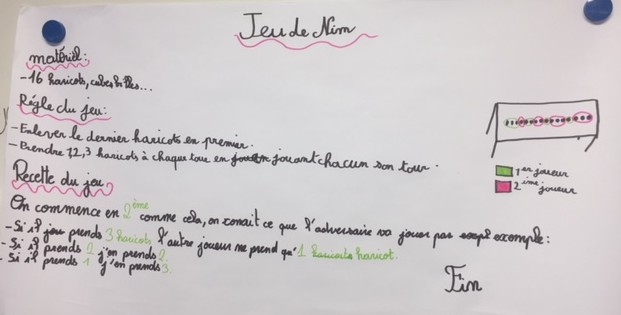 L’enseignant invite les élèves (par groupe de 3) à réaliser une affiche (sur feuille A3) qui permettra de donner la recette pour gagner (en vue de la communiquer à une autre classe, à une autre école par exemple). Toutes les formes (textes, schémas …) sont encouragées.