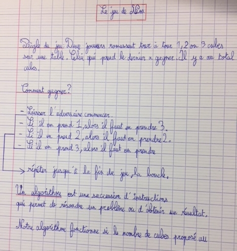 L’enseignant propose alors aux élèves d’écrire un algorithme qui permet de gagner si le jeu se joue avec 22 cubes. Les élèves par groupe de trois recherchent et écrivent l’algorithme. Ils peuvent s’aider de la trace écrite collectivement dans leur cahier. L’enseignant passe dans les groupes et aide si besoin les élèves (exemple : peut-être faut-il dans ce cas commencer à jouer si on veut gagner ?)