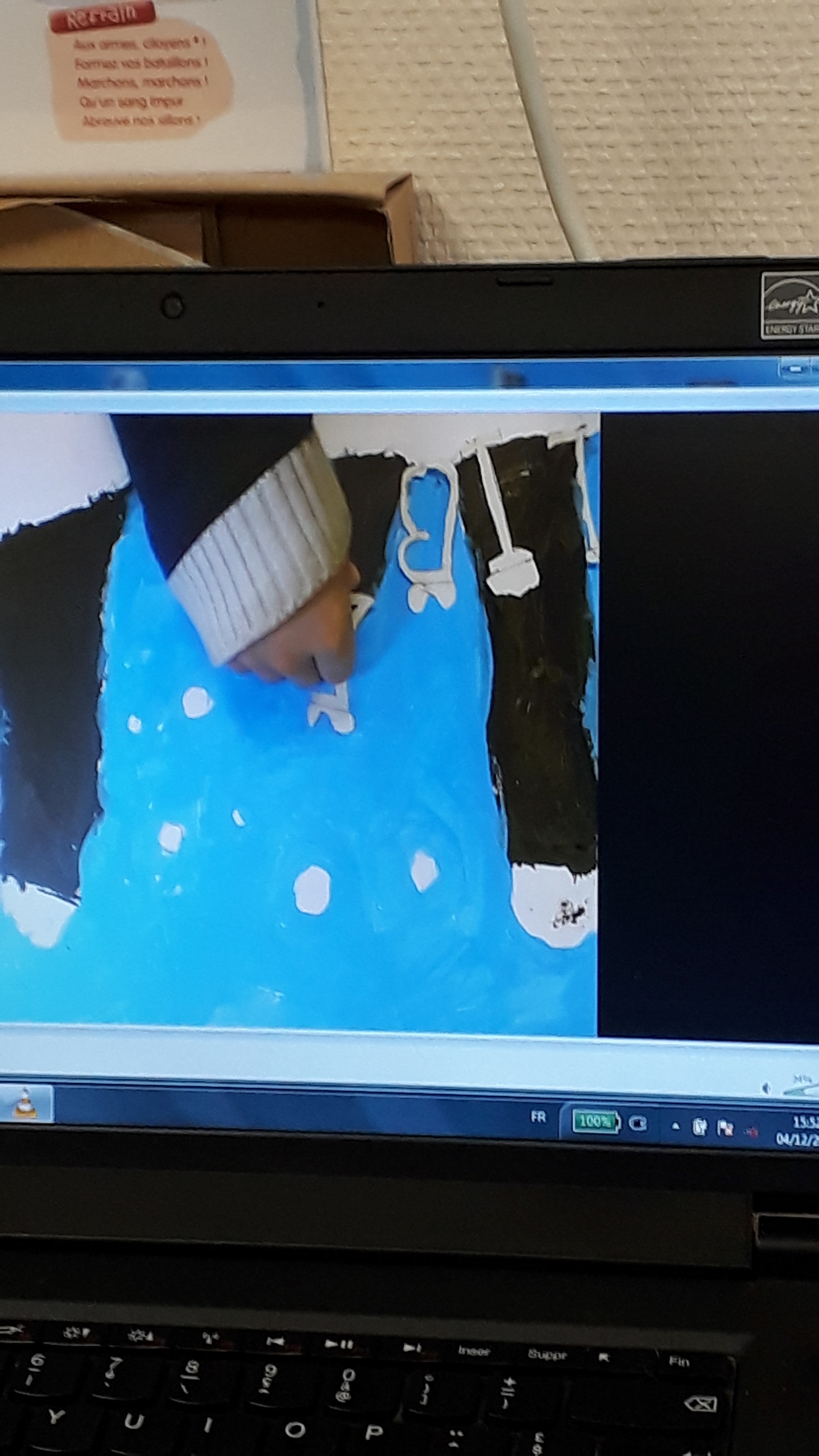 Quel son pour le film ? Réflexion collective. Décision d'enregistrer les voix des élèves récitant le poème. Une première version a été faite avec les voix, en chœur, de tous les élèves. Lors d'une écoute par un adulte ne connaissant pas le poème, le constat a été fait que les paroles prononcées n’étaient pas suffisamment compréhensibles. Le poème a donc été découpé et ré-enregistré pour que chaque enfant puisse dire quelques mots d'Eluard. Les enfants qui aimaient particulièrement la musique des Enfoirés souhaitaient pouvoir la mettre sur leur film. Cela a été l’occasion de discuter des droits d'auteur et des droits d'utilisation des musiques ou texte du patrimoine.