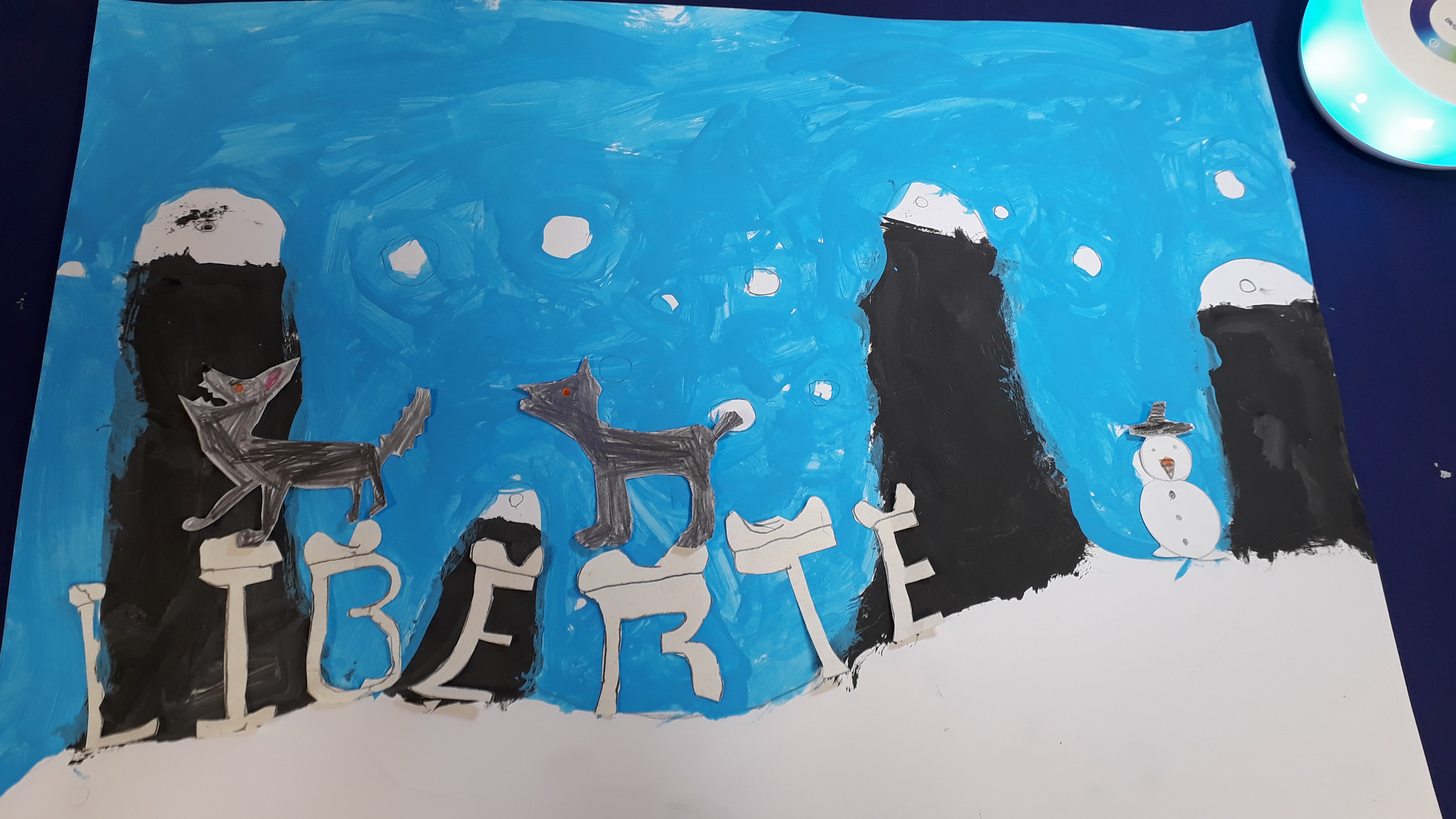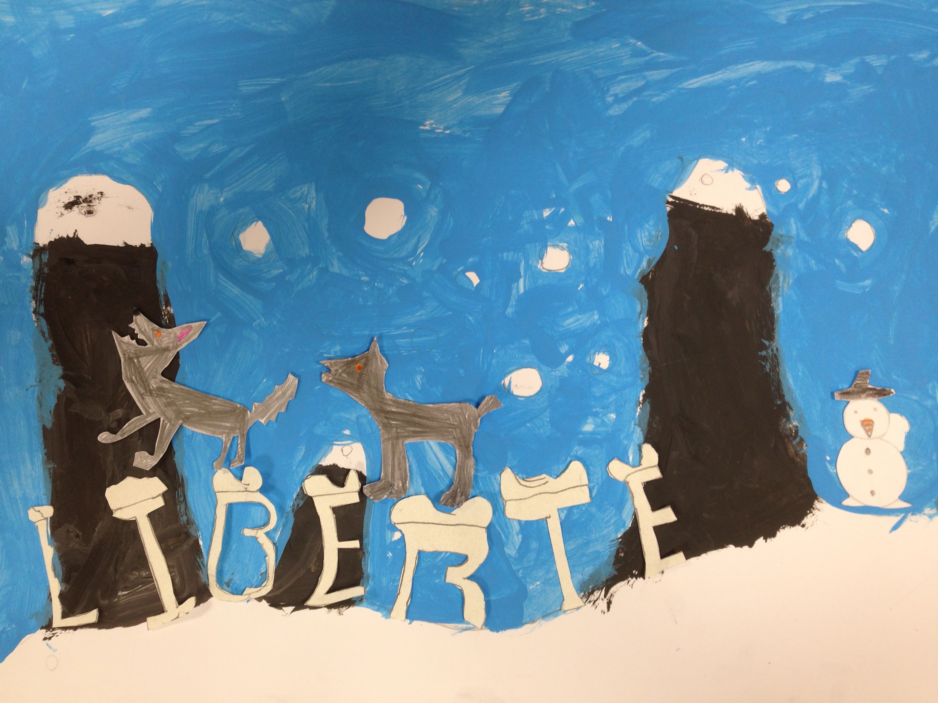 Décision d'ajouter des personnages sur le tableau de la neige (loup, bonhomme de neige), de faire comprendre le mot SANG en introduisant un avion de guerre puis un avion de PAIX qui viendrait déposer les lettres LIBERTE sur le sang.