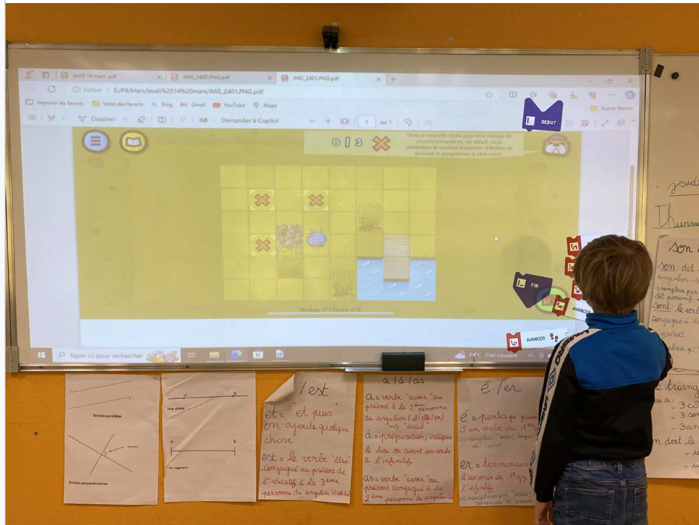 Dans une des classes, l’enseignante a imprimé le quadrillage du jeu. Les élèves tracent au stylo effaçable les déplacements et recherchent celui nécessitant le moins d’instructions avant l’assemblage des blocs. Cette approche est intéressante, car les élèves parviennent à s’accorder sur une stratégie de déplacement en amont. Une fois qu’ils sont tous d’accord, ils peuvent se concentrer sur le programme à réaliser.
