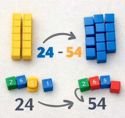 Add 24 to 30. First count up all the tens. Then count up the units. 5 tens make 50. 4 units make 4. 50 add 4 equals 54.