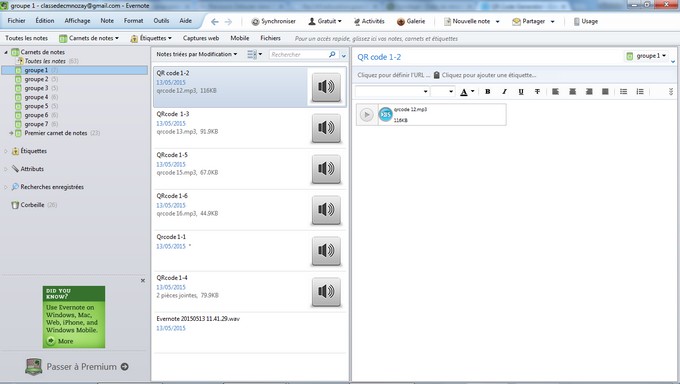 : enregistrer différentes notes audio en utilisant evernote, les renommer selon une codification donnée (qr-code « nom du groupe »- « numéro du message ») et les enregistrer dans le bon dossier.
