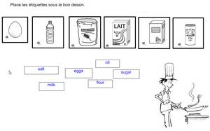 Page 1 : les enfants doivent cliquer sur l'image d'un ingrédient. Ils vont entendre le mot. Ils doivent retrouver l'étiquette qui correspond et la faire glisser sous le dessin.