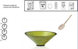 Le dossier notebook est prêt à être utilisé sur le bureau de chaque ordinateur . Plusieurs exercices sont proposés. Page 1 : les enfants doivent cliquer sur l'image d'un ingrédient. Ils vont entendre le mot. Ils doivent retrouver l'étiquette qui correspond et la faire glisser sous le dessin. Page 2 : il faut écouter la recette point par point et la reconstituer en déplaçant les ingrédients dans l'ordre chronologique. Page 3 : Les enfants écoutent et mémorisent une petite comptine. Ils doivent retrouver certains mots cachés.