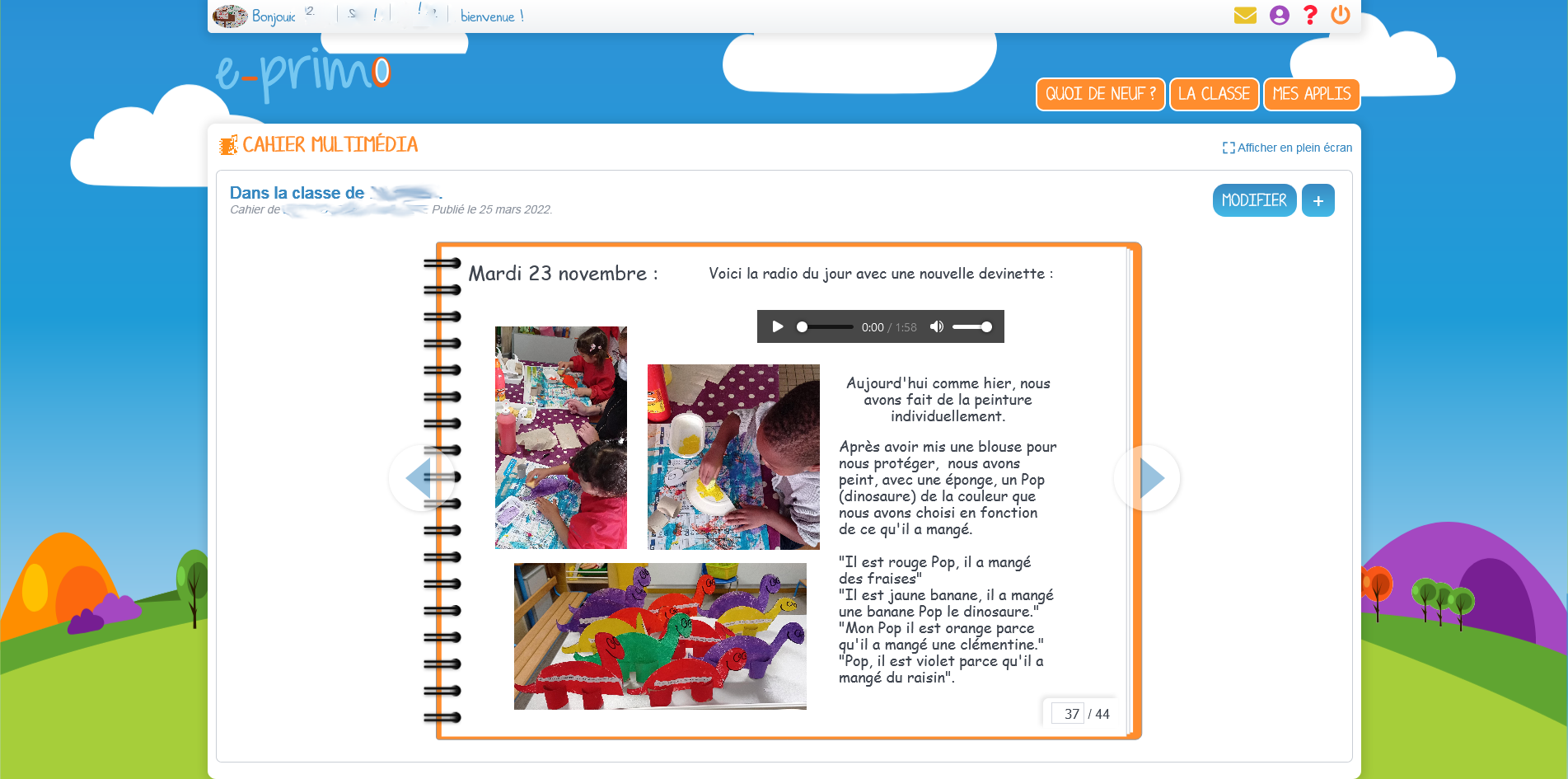 • Création d'un cahier multimédia par classe alimenté chaque jour par des photos, des enregistrements, des vidéos des activités de la classe. Les élèves de GS ont participé à l’élaboration des textes en dictée à l’adulte.
