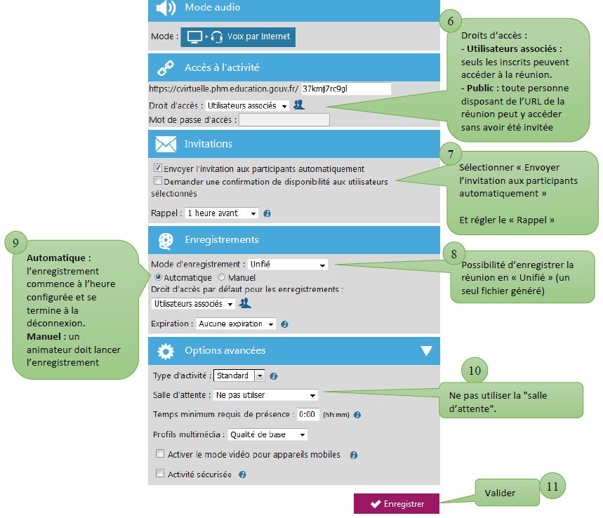 Étape 6/ Définir les droits d’accès (Utilisateurs associés ou Public). Étape 7/ Sélectionner « Envoyer l’invitation aux participants automatiquement » et régler le « Rappel ». Étapes 8 et 9/ Possibilité d’enregistrer la réunion en « Unifié » (un seul fichier généré) de façon automatique ou manuel. Étape 10/ Ne pas utiliser une salle d'attente. Étape 11/ Valider.