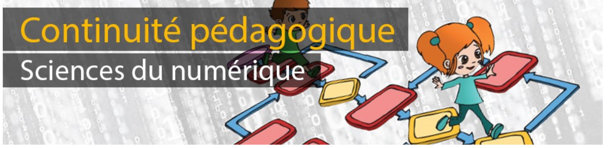 Vous trouverez sur le site de La main à la pâte un ensemble de pistes pour travailler sur le thème des sciences du numérique, avec ou sans ordinateur, en continuité pédagogique avec des élèves du Cycle1 au Cycle 4.