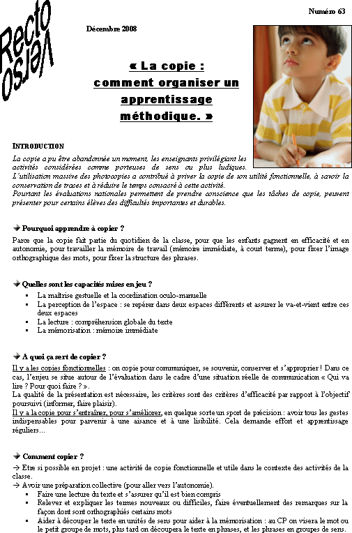 n°63 : la copie : comment organiser un apprentissage méthodique