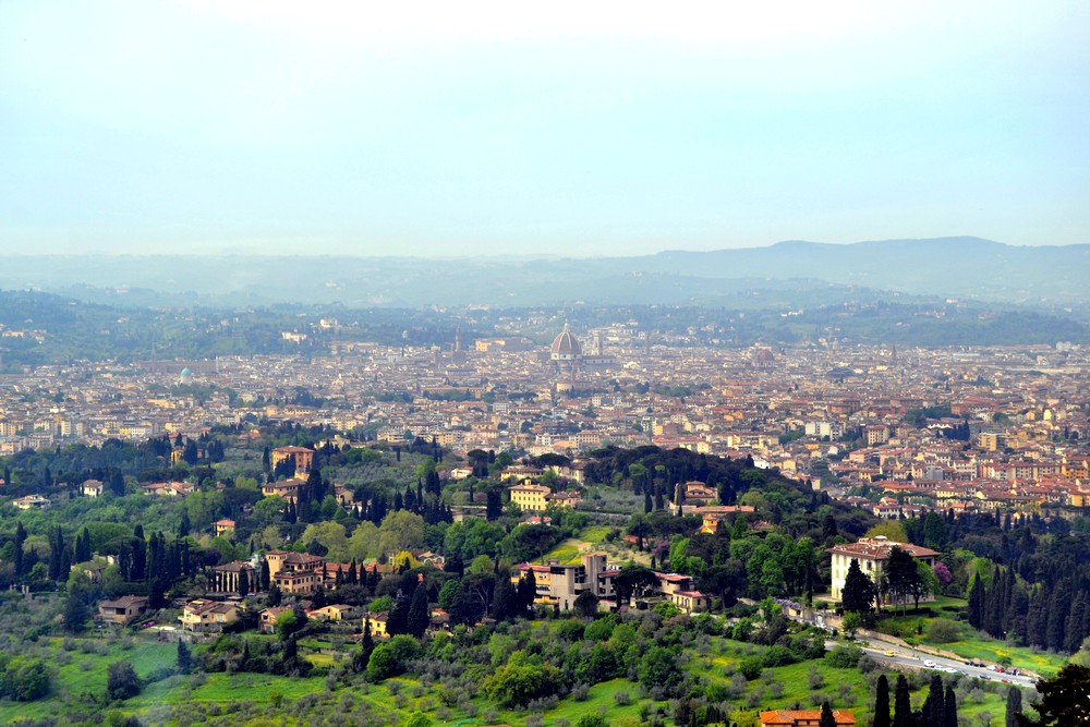 Vue de Fiesole, Florence s'étale au fond de la vallée de l'Arno. Ancienne capitale de l'Italie entre 1865 et 1871, Florence est aujourd'hui une des premières villes du pays. Elle compte près de 400 000 habitants et est un centre universitaire de renommée internationale. Même si le tourisme est devenu la première activité de la ville, il ne faut pas oublier que celle-ci rayonne sur la Toscane qui est une riche région agricole et une région industrielle de premier ordre.