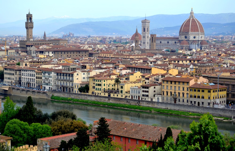 Voici le centre historique de Florence. Hormis le Ponte Vecchio présenté sur une autre fiche, les principaux monuments de la ville sont visibles sur cette photo. De gauche à droite : le Palais de la Seigneurie ou Palazzo Vecchio, la cathédrale Santa Maria dei Fiori et le petit toit blanc du baptistère.