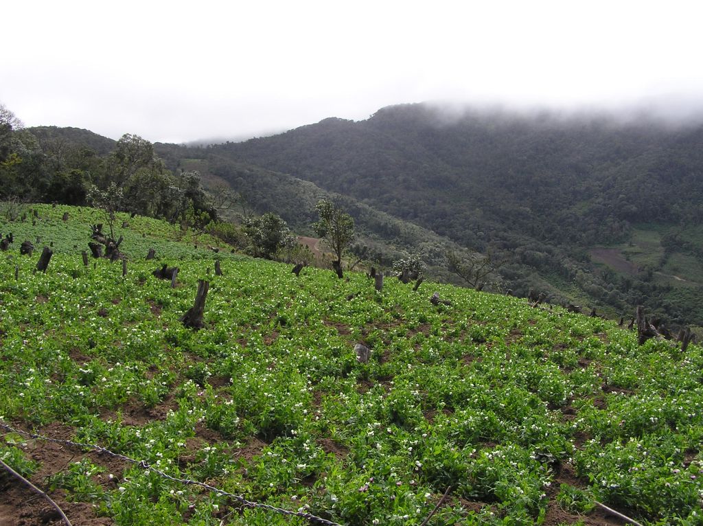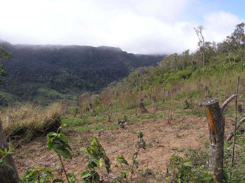 Deux exemples de champs gagnés sur la forêt pluviale que l'on aperçoit à l'arrière-plan sur les pentes. Le défrichement est visible par les restes de troncs, la deuxième photo montre une parcelle abandonnée après quelques années de culture. La végétation secondaire commence à se développer.