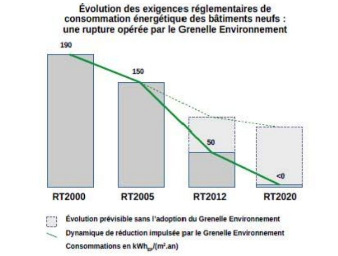 Pour atteindre cet objectif de performance énergétique, le plafond de 50kWhep/(m².an),valeur moyenne du label « bâtiment basse consommation » (BBC),est ainsi devenu la référence dans la construction neuve après le 1er Janvier 2013. Pour continuer sur l'objectif du Grenelle, un nouveau pas de géant nous attend en 2020 avec la RT 2020 qui prévoira de construire des BEPOS;
