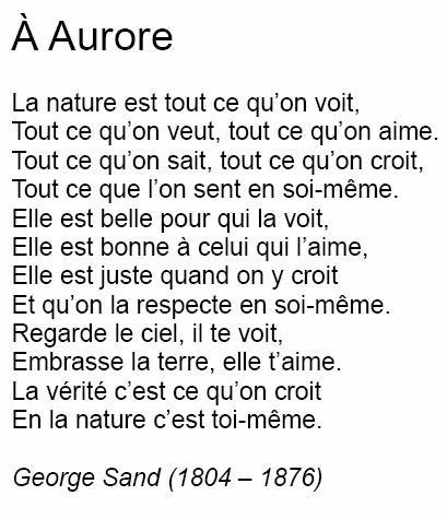 Publié le 24 mars 2015 - Mis à jour le 4 mai 2015 c'est le printemps au collège Rutigliano (Nantes) le printemps des poètes du Casnav Le 23 mars 2015 _ Le collège Libertaire Rutigliano nous a adressé un poème, A Aurore, de George Sand. Il est lu par Florin, Maria et Cosmin. Qu'ils soient ici félicités et remerciés ainsi que leur professeur de FLS, Amélie Foucoin.