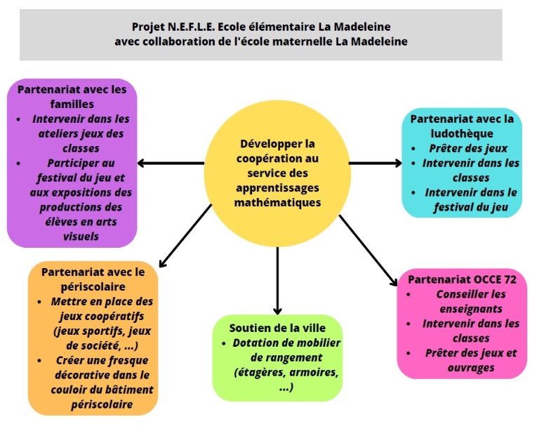Après réflexion autour des résultats des élèves de CP et de CE1 aux évaluations nationales en mathématiques, l'équipe enseignante soumet l'idée de développer l'utilisation de jeux se société coopératifs , de matériel de manipulation pour toutes les classes de l'école. L'école maternelle La Madeleine pourrait poursuivre la collaboration, déjà engagée dans la constellation mathématiques, avec l'école élémentaire dans ce projet.