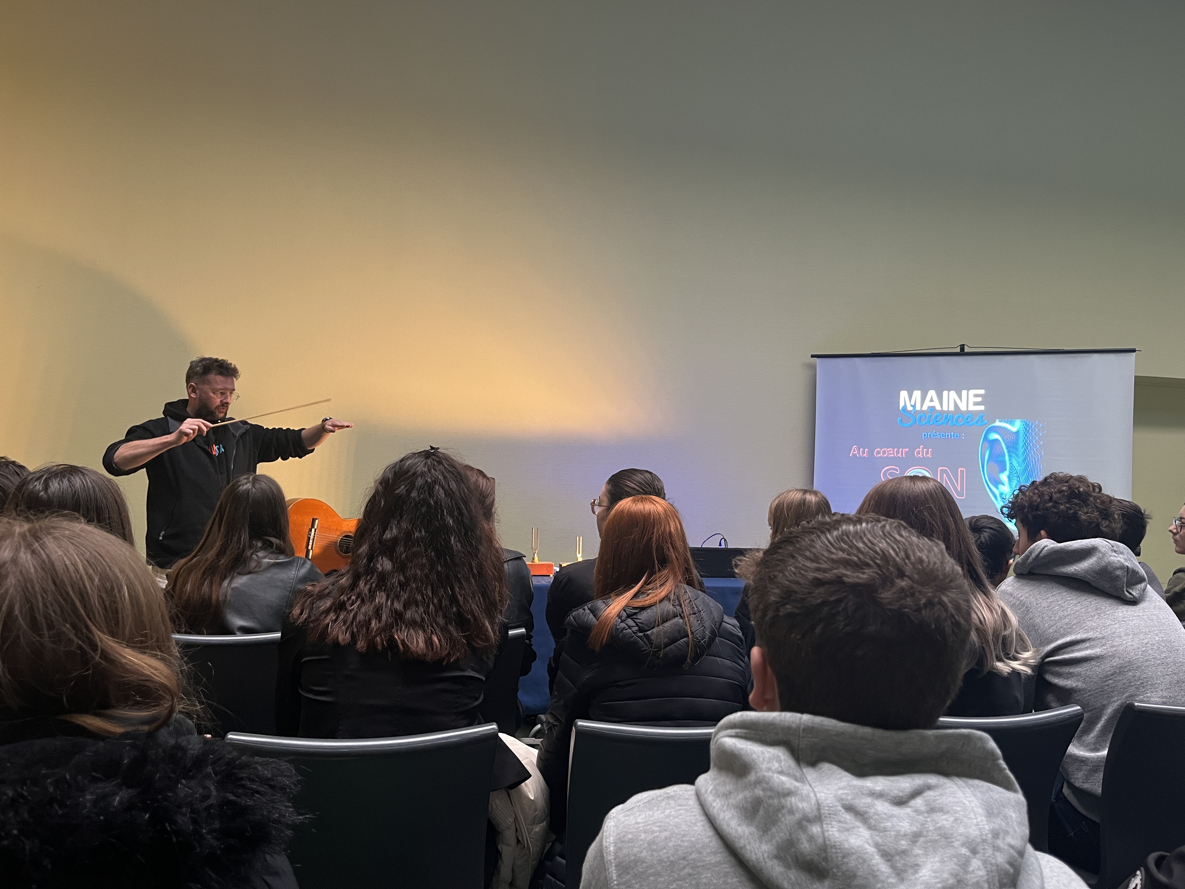 Cela a été le cas des élèves de 3e du collège Léo Delibes de Fresnay sur Sarthe qui ont également bénéficié d’un atelier mené par les membres du dispositif Maine Sciences, intitulé ”Au Cœur du Son”.