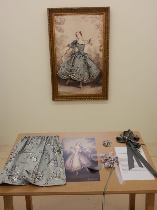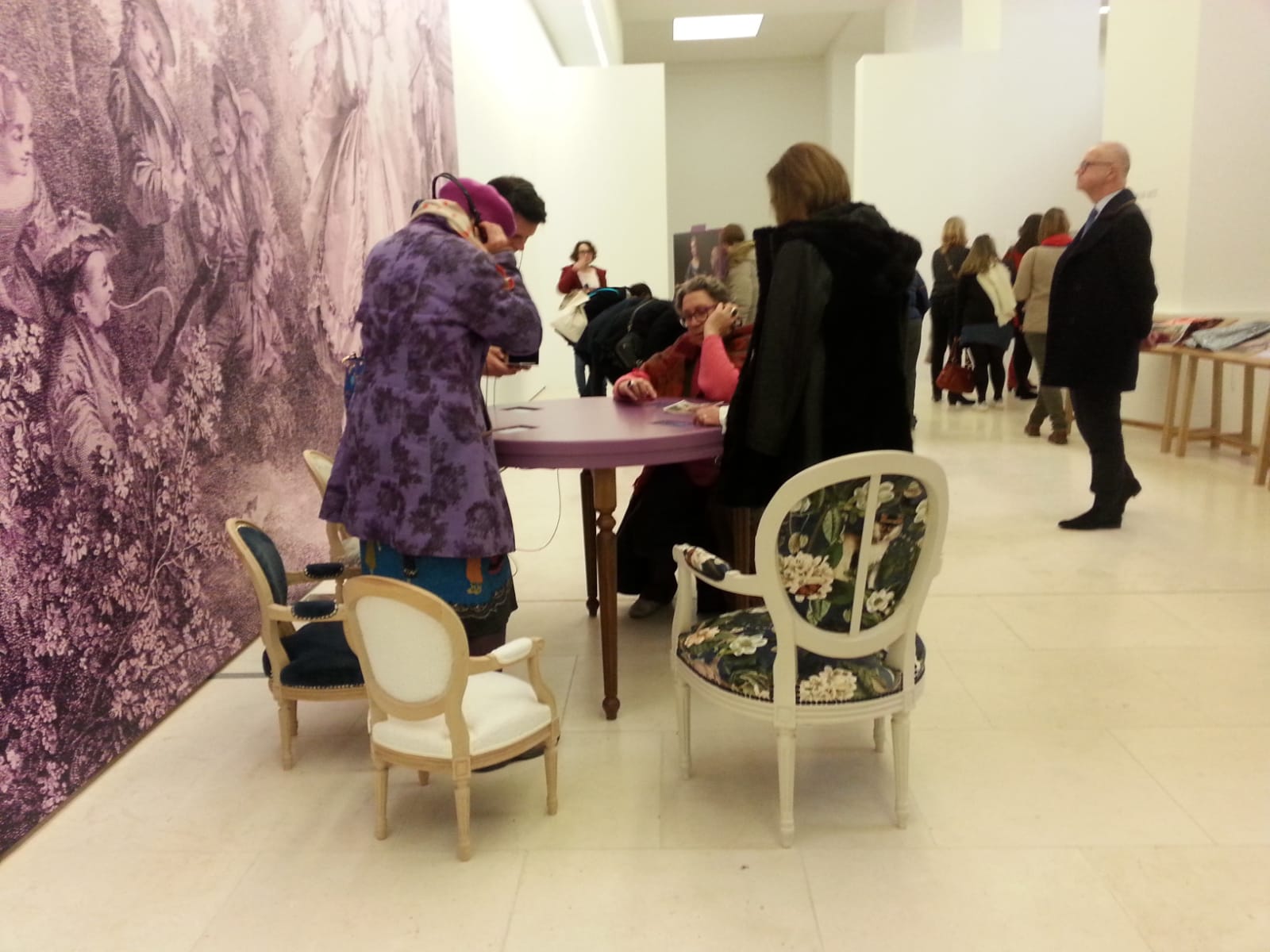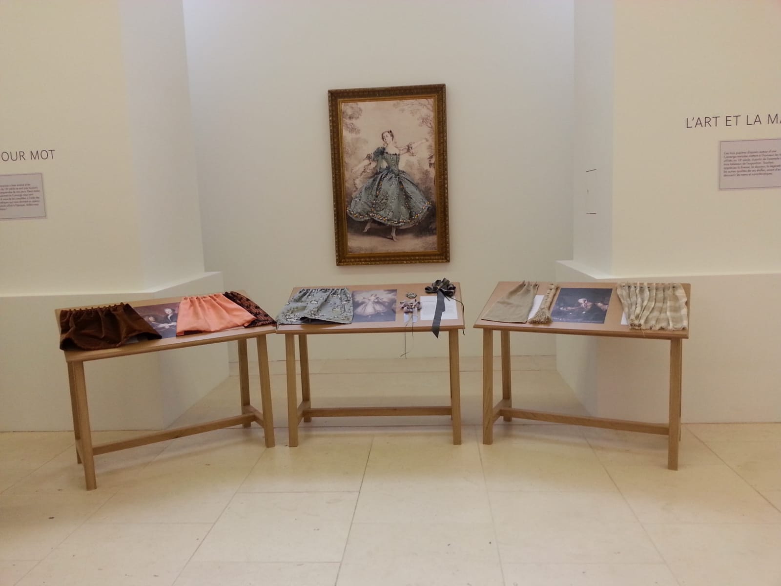 - Pour l’espace « l’art et la matière » : 1 « tableau tactile » de « la Camargo » (peinture phare de l’exposition ) et 3 pupitres présentant les différents textiles de l’époque (textiles fournis par une entreprise du patrimoine Français). Ceci réalisé dans le cadre des cours de tapisserie décor.