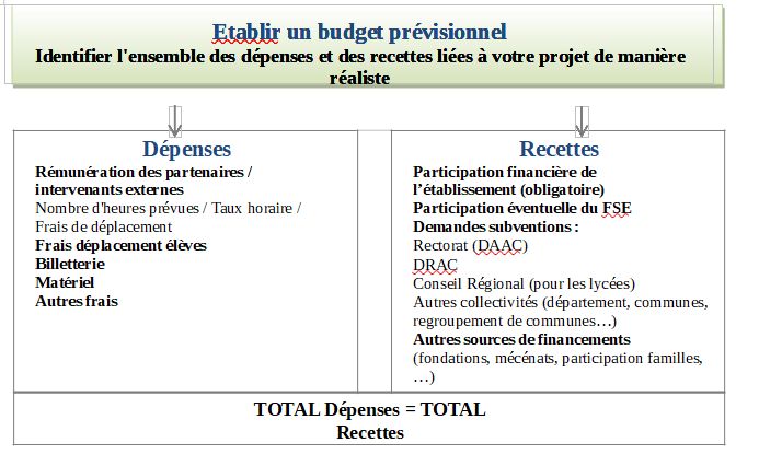 4.3 Budgétiser : le budget doit équilibrer les dépenses et les recettes. Il est important de le construire minutieusement, si possible avec l’aide du gestionnaire de l’établissement pour éviter les erreurs. Le Rectorat (DAAC) intervient dans le financement de certains de projets du second degré pour aider au financement de la rémunération du partenaire intervenant dans le projet.