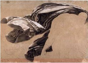 Le dessin représente l'étude de draperie qui couvre le vieillard porté par le jeune fils dans le tableau du Louvre, Scène de déluge. L'artiste a ajouté une bande de papier dans le bas du dessin. Elle se distingue par sa couleur plus foncée. Juste au dessus de cette bande, à gauche, une inscription indique: « Cette étude me vient directement de Girodet et a servi au tableau du Déluge, au musée du Louvre. Ate Galimard »