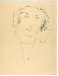 Visage de femme naît de quelques traits. Cette impression "d'émergence d'une forme", ici humaine, est générée par le caractère inachevé du dessin. La chevelure, le visage et les épaules se perdent dans le support du dessin. La pierre dans un premier temps, le papier ensuite. De la simplicité apparente de l'ensemble surgit des forces. Selon MATISSE: " les lignes sont des forces, et dans le jeu de ces forces, dans leur équilibre, réside le secret de la création." (1)