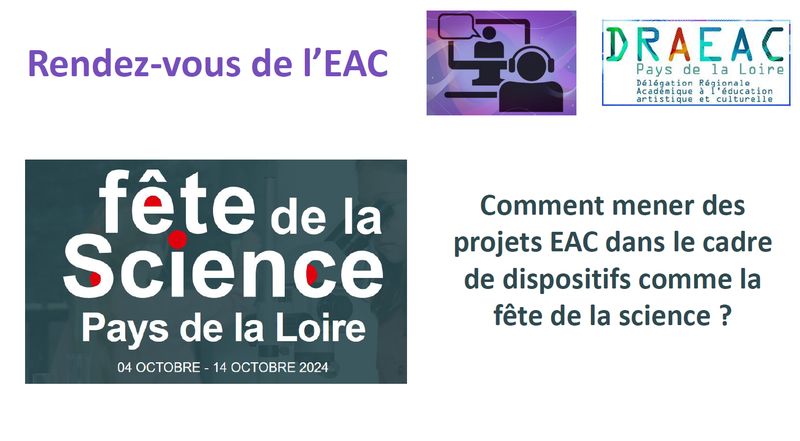 Pour en savoir plus avec le rendez-vous de l'EAC du 13 juin 2024 consacré aux projets EAC dans le cadre de la Fête de la science. On trouvera des précisions concernant l'accompagnement possible avec la DRAEAC, des apports pédagogiques et des projets d'établissements valorisés lors de la Fête de la science.