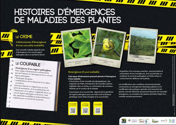 L'exposition a été réalisée avec des chercheurs en pathologie végétale (INRA, ANSES). Le visiteur mène l’enquête sur ces 3 maladies émergentes introduites en Europe (Xylella fastidiosa, Pseudomonas syringae pv. actinidiae, Venturia inaequalis). Le voyage des plantes, la mondialisation, le changement climatique et les nouvelles pratiques culturales en sont les complices.