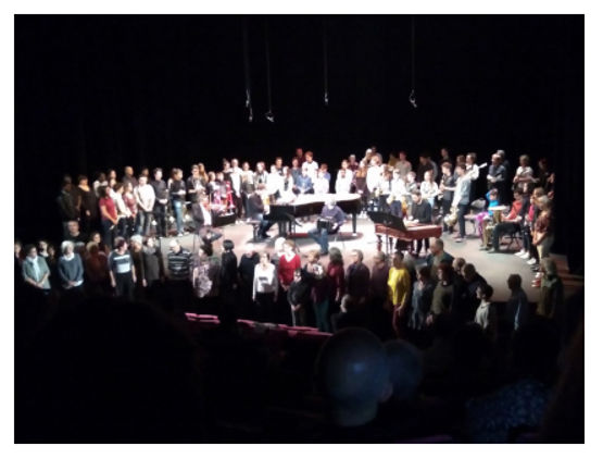 -Mise en forme d’un concert-lecture réunissant les élèves et les musiciens, où alternent chant collectif avec accompagnement instrumental, interventions parlées des élèves, pièces instrumentales.
