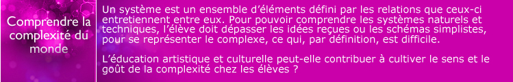 On trouvera dans les ressources associées à cette rubrique des exemples concrets de démarches d’éducation artistique et culturelle permettant aux élèves d’accéder à une meilleure compréhension du complexe.