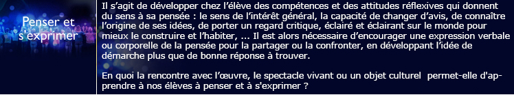 La rencontre avec l’œuvre, le spectacle vivant permet d’apprendre à penser et à s’exprimer. Elle développe l’expression verbale et corporelle, et ainsi, contribue à sa structuration. Elle construit un collectif qui fonctionne comme un espace positif pour apprendre en toute confiance à s’exprimer.