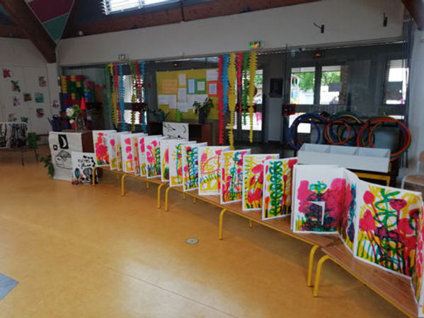 Toutes les classes ont écrit des poèmes Lucie Vandevelde est venue présenter son métier d’illustratrice. Elle a ensuite réuni les élèves par classe dans un lieu dédié à l’illustration pour la semaine (salle de motricité)