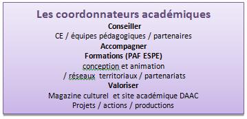 La Délégation académique à l’éducation artistique et à l’action culturelle (DAAC) a pour objectif de favoriser la mise en place des parcours d’éducation artistique et culturelle (PEAC) grâce au développement des projets d’éducation artistique et culturelle (EAC) au sein des établissements scolaires. Elle participe au projet académique dans la mise en œuvre des quatre axes prioritaires et en particulier dans le deuxième axe : « Favoriser une insertion réussie dans la société ».