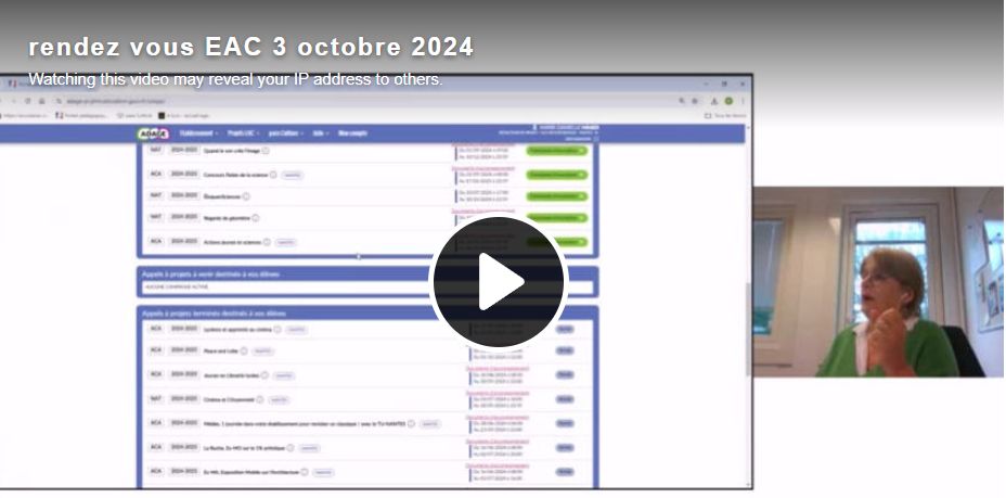 " La Délégation régionale académique à l'éducation artistique et culturelle (DRAEAC) est mobilisée pour vous accompagner dans la découverte et l'appropriation des outils de l'EAC et au-delà, elle souhaite promouvoir auprès des établissements scolaires, des dispositifs initiés dans les territoires, faire découvrir les opportunités et les partenariats de proximité mobilisables. C'est pourquoi sont organisés régulièrement les rendez-vous de l'EAC. Ces temps en distanciel d'une demi-heure aborderont une thématique propre. Ils s'adressent aux référents culture prioritaiement, mais toute personne intéressée peut s'y inscrire. Il suffit de suivre la procédure ci-après, en remplissant le formulaire joint. Ces réunions sur un temps court se veulent efficaces et pragmatiques. Votre contribution y est essentielle. " Marie-Danielle Minier |
