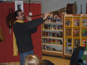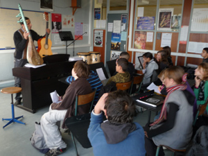 Après une vidéo sur la fabrication artisanale des instruments berbères, Mohammed Hadri comparent le loutar et la guitare, instruments à cordes pincées. | ![]() Monsieur Briand présentant le Nfar ou Nafir aux élèves de 5è 1 et 3 au collège de Chantenay( trompette principalement utilisée durant le mois du Ramadan pour annoncer des manifestations relegieuses) |