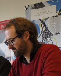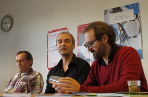 Trois d'entre eux sont présents, dont Eric Pessan qui se définit comme "auteur". Il publie des romans, des nouvelles, du théâtre, de la poésie et anime plusieurs revues littéraires. Il présente les deux auteurs qui l'accompagnent : Antoine Emaz qui se définit avant tout comme "poète", écrit aussi sous forme de notes de travail et collabore très souvent avec des artistes, et Martin Page qui se définit comme "écrivain", auteur de fictions pour adultes et aussi pour la jeunesse, il est publié notamment aux éditions de l'Olivier et à L'Ecole des Loisirs (Ophélie Jaësan, invitée elle aussi, a été empêchée).