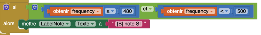 Un code programmé avec un outil gratuit en ligne permet avec des blocs algorithmiques de construire des comportements liés à la fréquence du signal sonore mesuré.