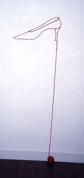Olga BOLDYREFF, Escarpin, 1997, œuvre de la collection du Frac des Pays de la LoireDessin-de-fil, pointe en acier, fil de coton, boîte en carton contenant un patron, un plan de montage et une pelote de fil, 30 x 60 cm Cliché : Christian Leray, Nantes