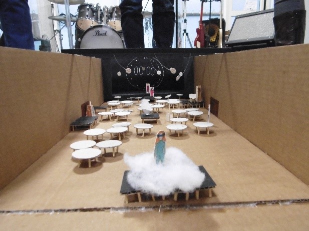Elle a expliqué aux élèves en quoi consistait son métier et les a invités à réfléchir à la scénographie du Cabaret philosophique. Par groupe, ils ont tous réalisé une proposition de scénographie. Des éléments de toutes les propositions ont été conservés. Pour rendre la pensée vivante et pour immerger le spectateur dans la réflexion, il a été question de déterminer plusieurs espaces de jeu entourant le public afin de « l’immerger » dans le débat d’idée. D’où la forme “Cabaret”. Les élèves ont investi la classe d’arts plastiques du lycée, et ont fabriqué une maquette de la salle afin de choisir le nombre et la taille des espaces de jeu. Ils ont eu de nombreuses idées concernant les éléments visuels, les costumes. Ils se sont pleinement investis dans cette partie de la création également, qui leur a permis de travailler avec une artiste professionnelle, de se mettre d’accord sur des choix artistiques, de développer leur imaginaire, d’oser surprendre les autres.