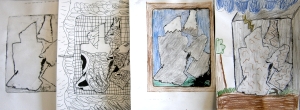 A partir des réalisations par groupe de deux, chaque élève récupère la moitié du tirage effectué qu'il rehausse librement pour faire ressortir des formes figuratives.