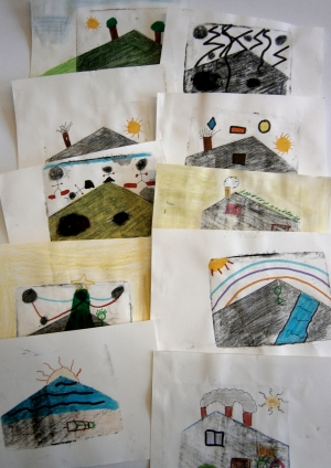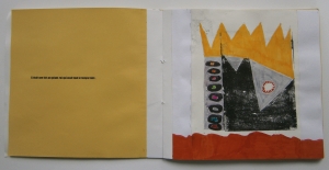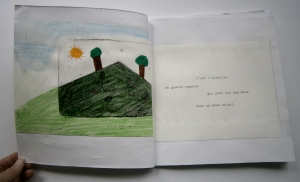 Initiation à la lithographie, exploration des possibilités du moyen d'impression à l'aide de consignes à appliquer pour introduire le hasard, le fortuit pour l'utiliser, le détourner, le valoriser... Le texte venant à la suite de l'image, à partir de l'image. Réalisation d'un livre par élève.
