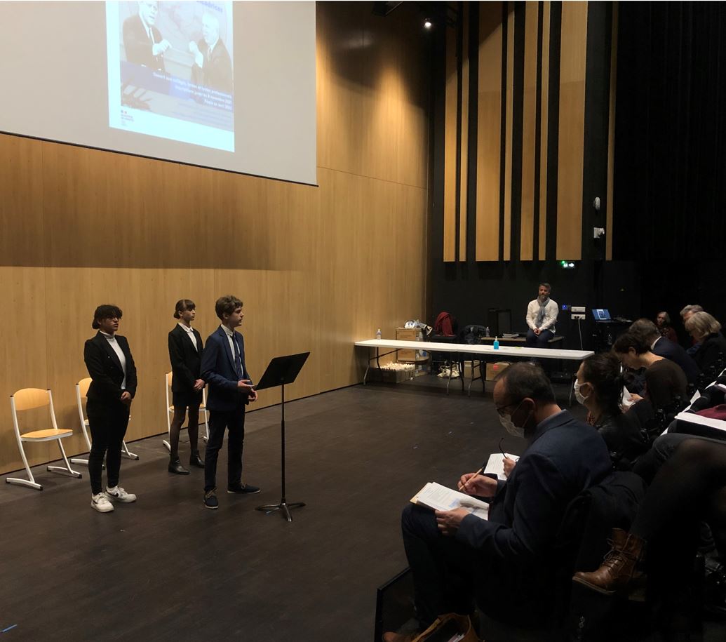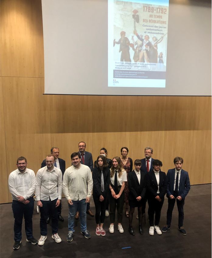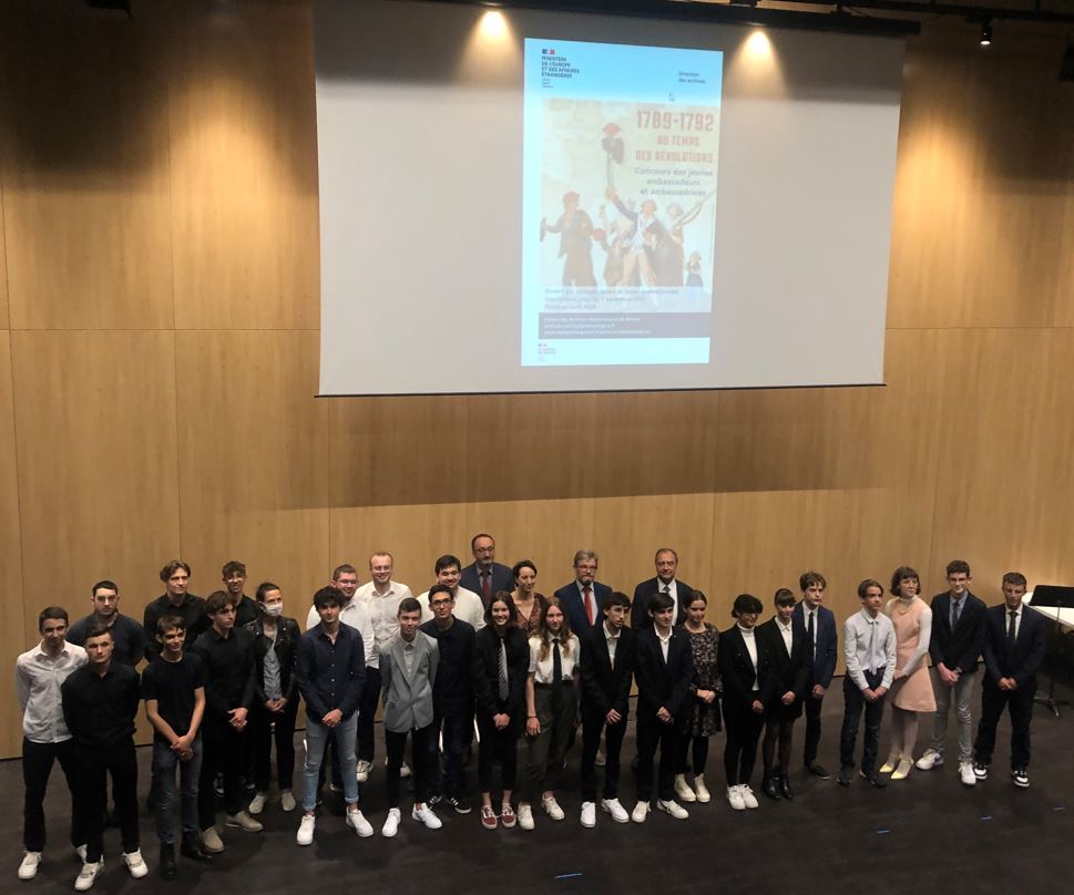 Le 29 avril 2022, au lycée Nelson Mandela, le jury du concours a choisi parmi les finalistes des Pays-de-la-Loire les élèves du collège Noë Lambert (Nantes, 44), du lycée Jean Perrin (Rezé, 44) et du lycée professionnel Chevrollier (Angers, 49). Ils seront rejoints à Paris par les lauréats de la finale d’Ile-de-France, le 3 juin prochain, pour la remise des prix à l’Hôtel du Ministre La finale s’est déroulée à Nantes avec la participation d’une centaine d’élèves et d’enseignants. Le jury était présidé par M. Jean-Yves Roux, ambassadeur.