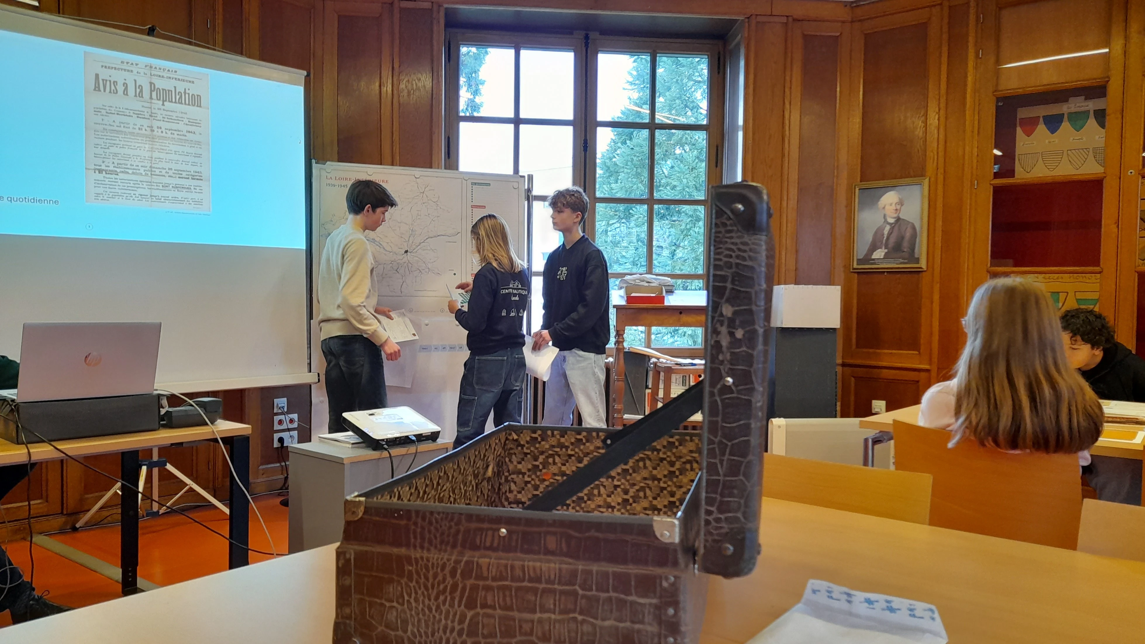 Dès janvier, les élèves ont découvert aux Archives Départementales une malle pédagogique contenant des documents d’archives locales, tels que des lettres, affiches, liste de prisonniers, photos, cartes de déportés, qu’ils ont manipulés, analysés et classés selon un thème bien précis : 50 Otages, propagande, résistance, vie quotidienne ou persécutions. Il leur a été ensuite demandé de les placer sur une frise chronologique et une carte géante du département. Enfin, à l’image de résistants, les élèves ont déchiffré des messages codés, cachant des valeurs de la Libération.
